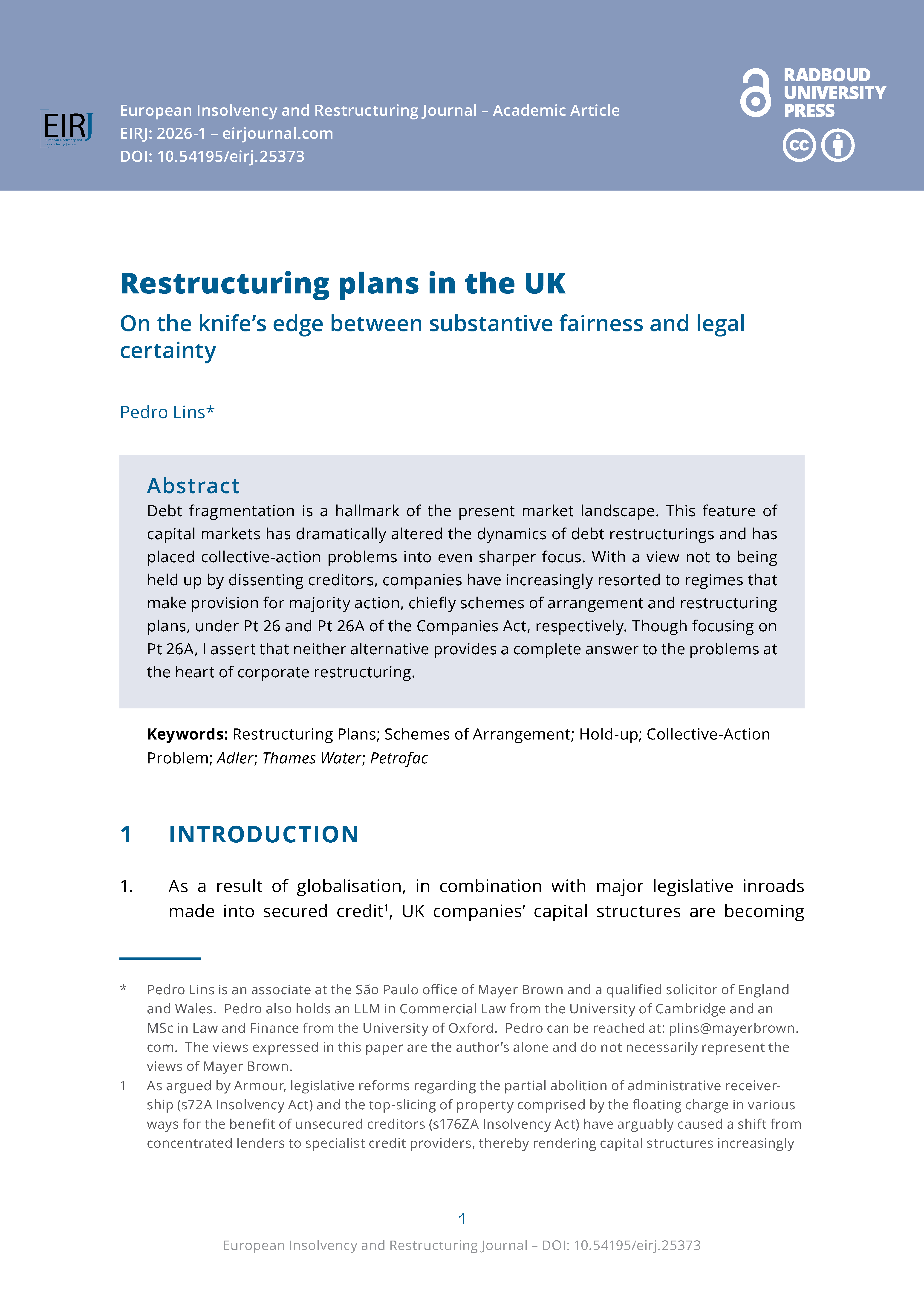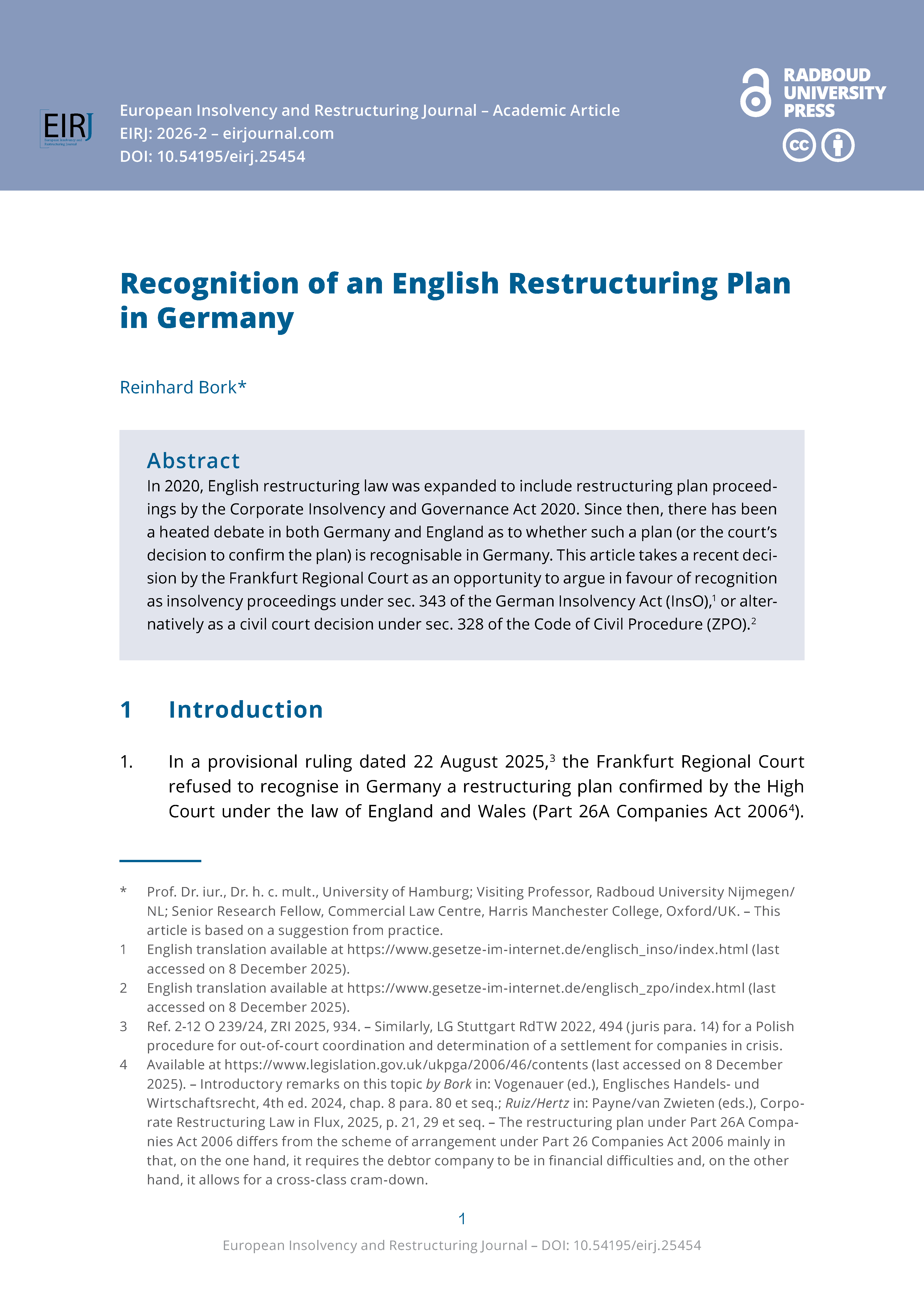 The European Insolvency and Restructuring Journal is a fully open access and double-blind peer reviewed journal focused on the development of insolvency and restructuring laws and practice in Europe.