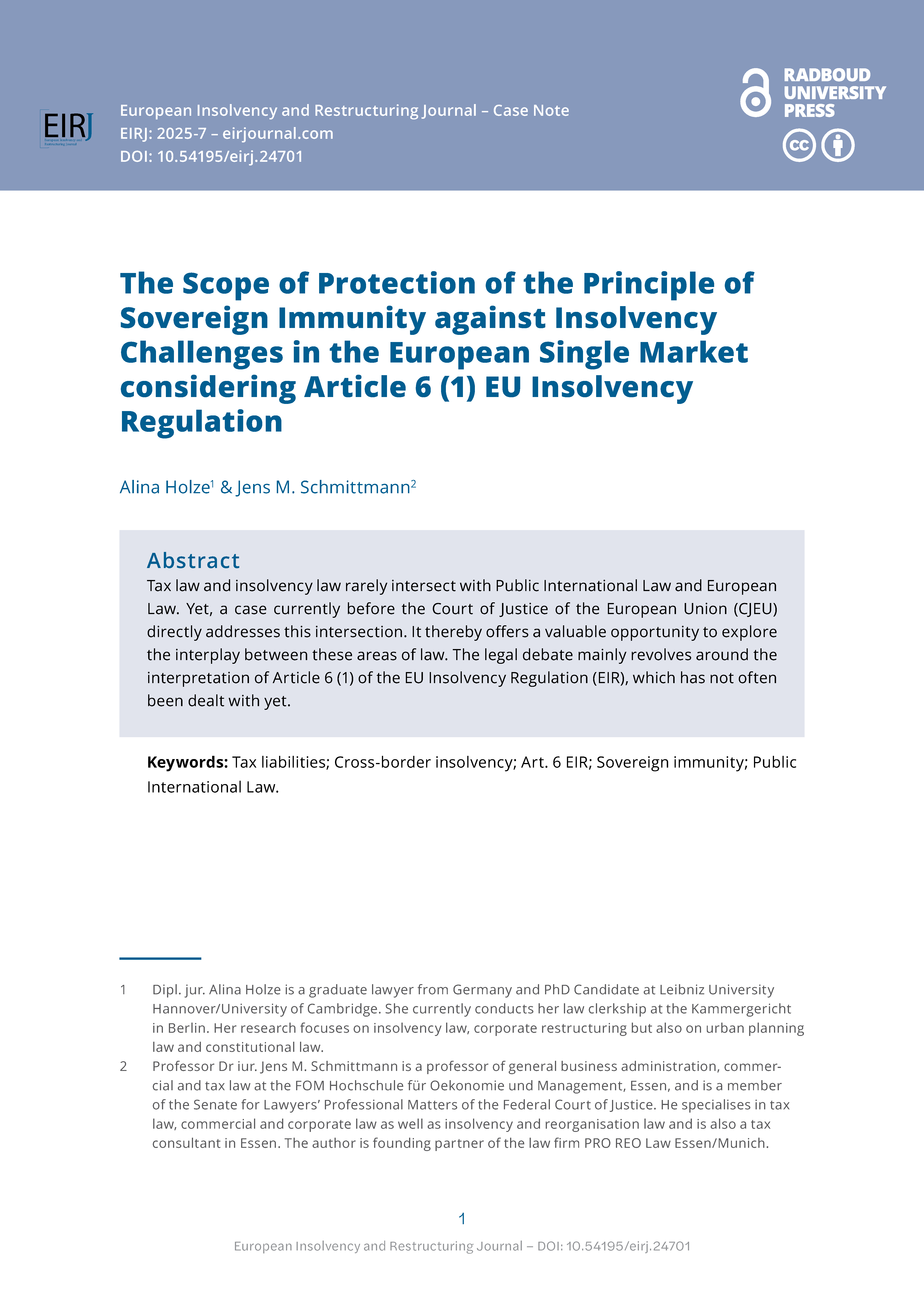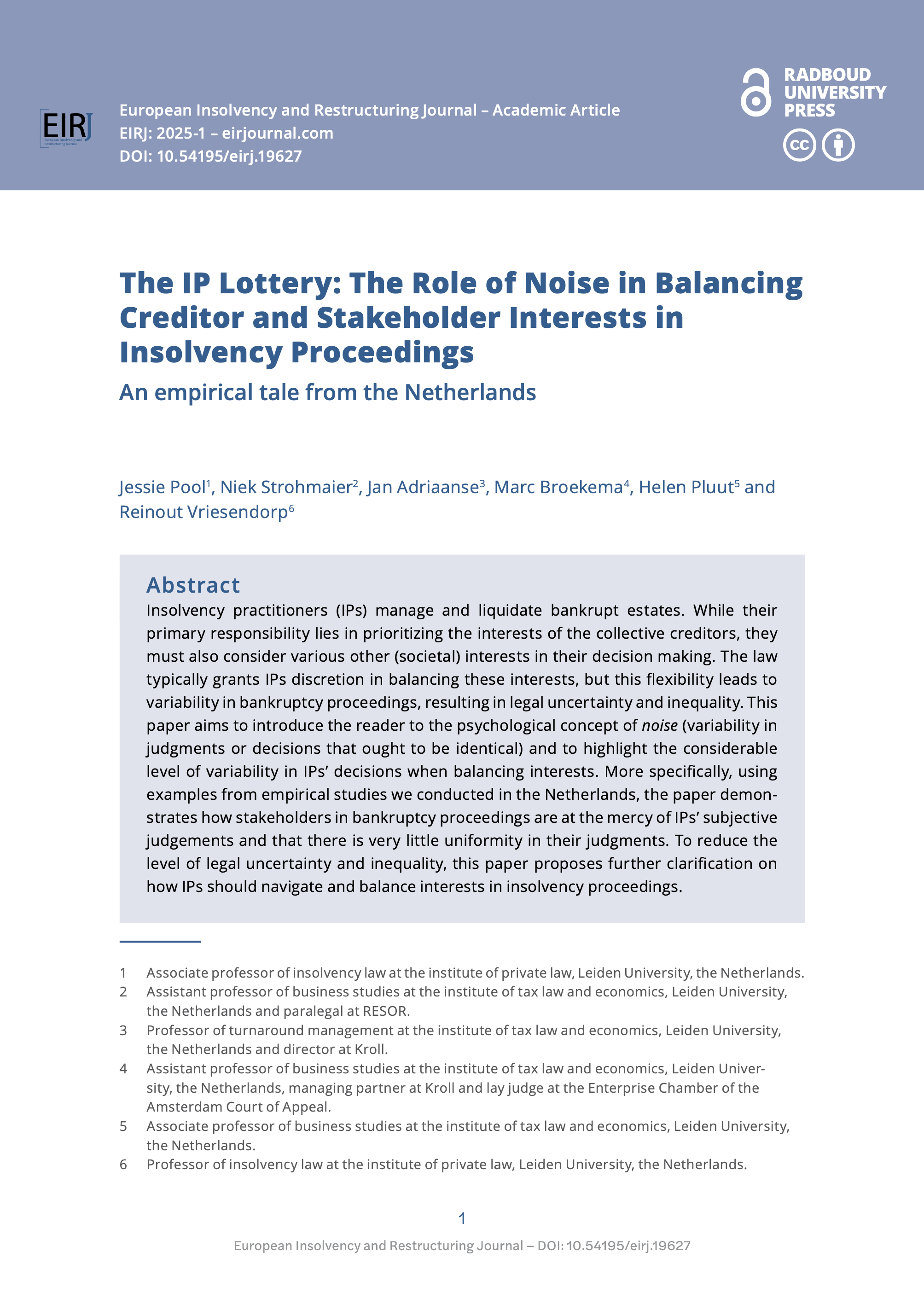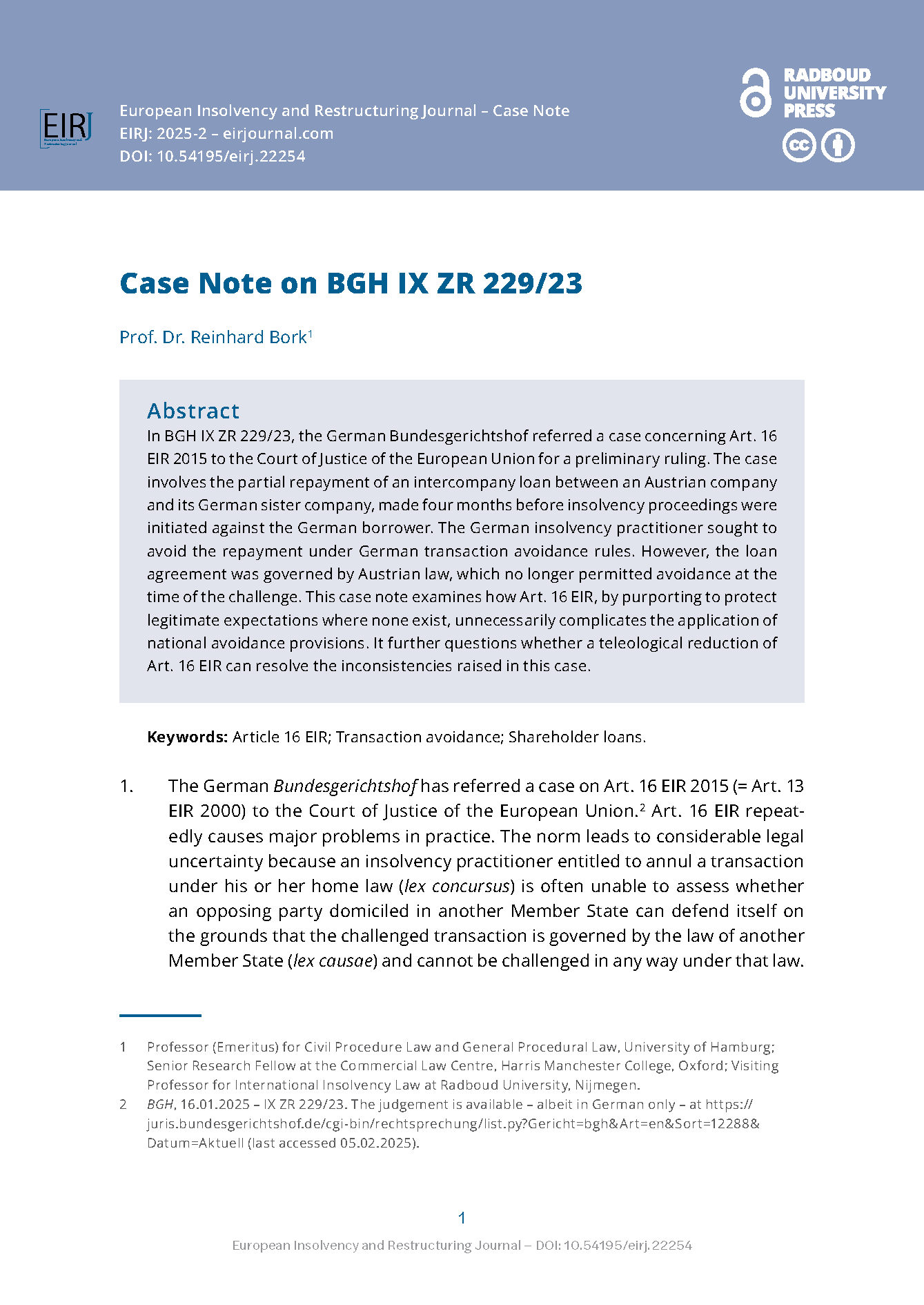 The European Insolvency and Restructuring Journal (EIRJ) aims to provide a solid and authoritative forum for in-depth (comparative and empirical) articles on topics that are of relevance to the development of insolvency and restructuring laws and practice in Europe. It aims to promote academic discussion which crosses national boundaries, mainly in the field of European preventive restructuring and corporate insolvency law.