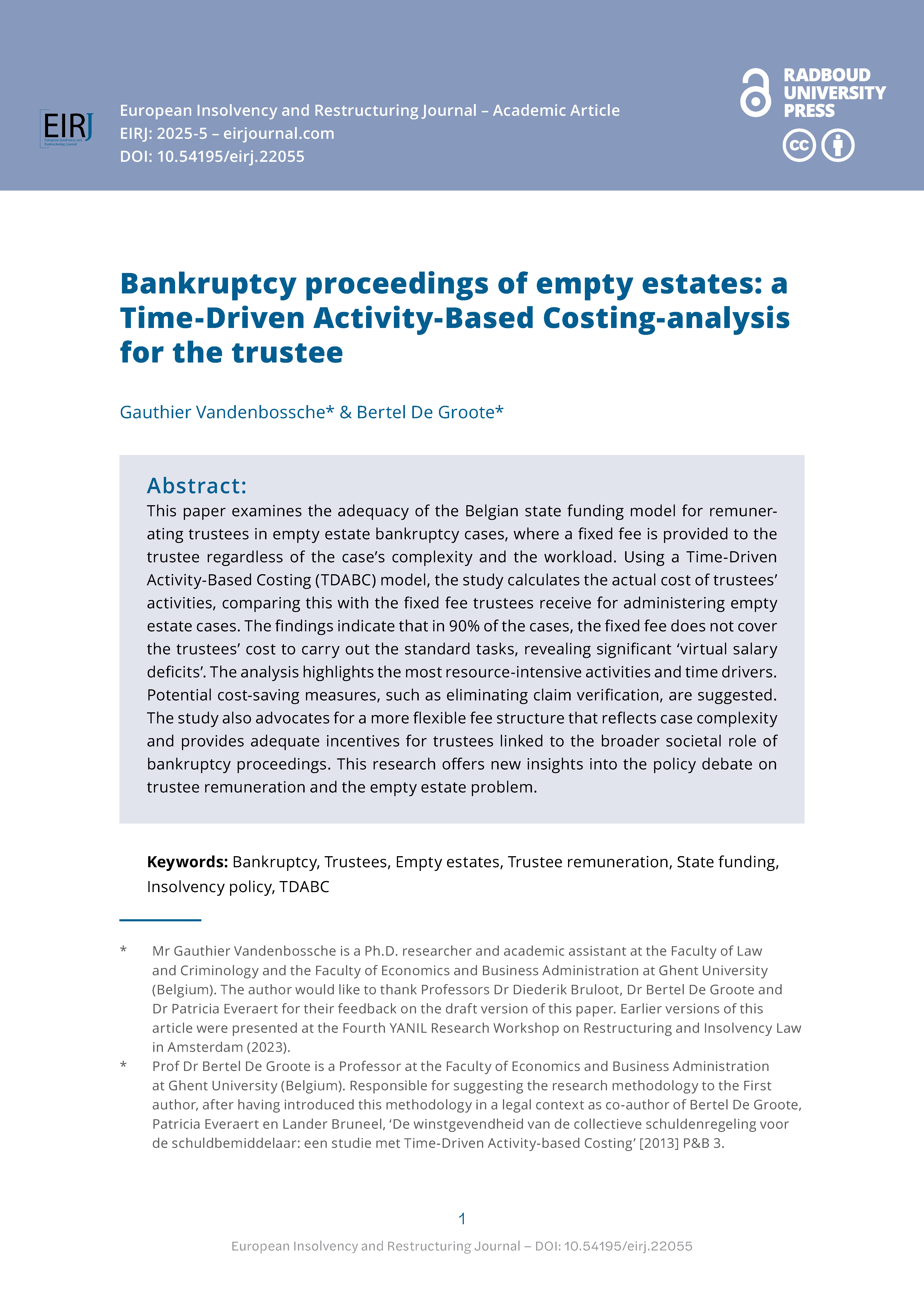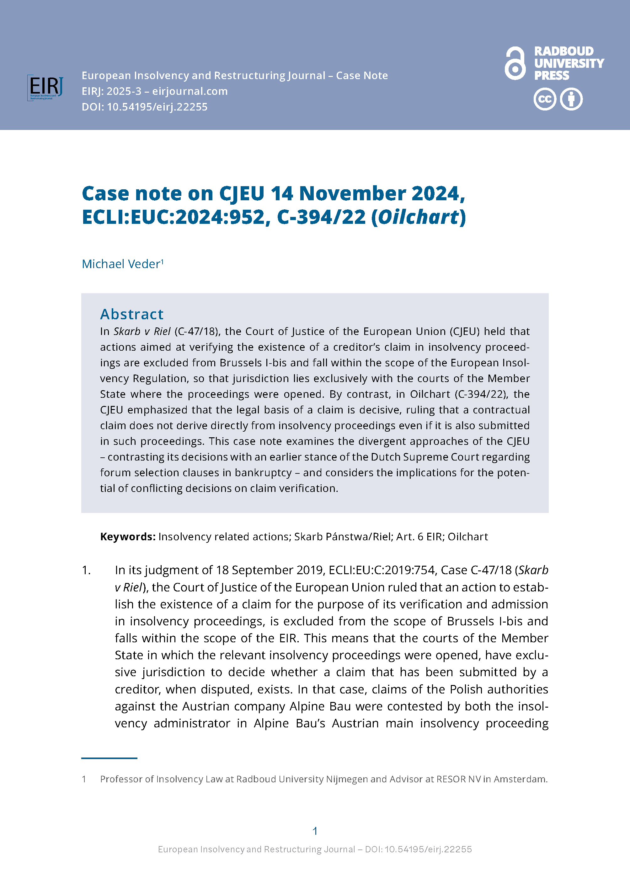 The European Insolvency and Restructuring Journal is a fully open access and double-blind peer reviewed journal focused on the development of insolvency and restructuring laws and practice in Europe.